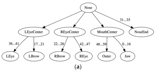 Figure 3a summarizes the basic tree structure considered. A numerical label on a tree edge in Figure 3a indicates the index of the corresponding facial landmark point in Figure 2 that defines the end of a primary/secondary vector, where, in the interest of simplicity, adjacent tree nodes are grouped together.