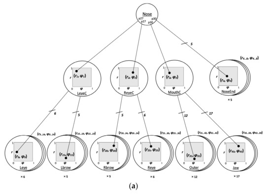 A structured representation of facial landmarks points was pursued toward retaining structural semantics regarding face topology. More specifically, facial landmark points were ad hoc structured in a three-level tree hierarchy of vectors in polar coordinates (r,φ), as follows [34,35].