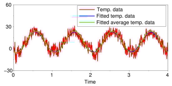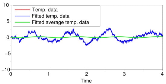 Remark 2. Earlier, we assumed that k was known. Now suppose that k is unknown. Assuming for the moment that the stochastic integral terms in (5) are negligible, the ‘period’ P can be estimated throughIn Figure 3, we see that there is a ‘crest’ that starts at around and ends at around . Taking , then . This could be taken as the k fixed in the above linear regression. However, a more reasonable approach is to assume that k lies within some range, say , and test different values of k ranging from to . For each such fixed k, we apply linear regression as above and compute the -error between and . When the -error is less than some predetermined tolerance, the corresponding k is chosen and the rest of the parameters a, , , and are estimated. 3.4. Parameter Estimation for a Stochastic Harmonic Oscillator Temperature Model Using Real Data