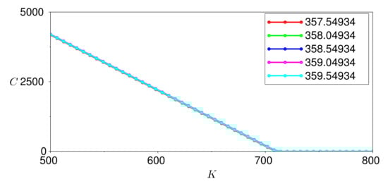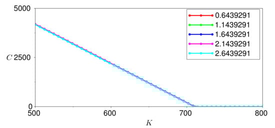 Remark 4. As HDD/CDD indices depend on the number of days over which they are considered, and for any , we deduce thatSimilarly, . Hence, HDD/CDD indices rise with increasing n. For example, let us return to the results in Section 3.4 which are summarised in Figure 5. HDD months for Toronto at the CME are from January to April and from October to December. For the four-year period from January 2005 to December 2008 (), the HDD months would correspond to the periods October 2005–April 2006 (), October 2006–April 2007 () and October 2007–April 2008 (). We calculate in (13) during these three periods. The results are shown in Figure 6. The data set was used to compute the observed HDD (red graph), while the data set was used to compute the expected HDD (blue graph). As anticipated, . 4.2. Call Option Pricing: An Example