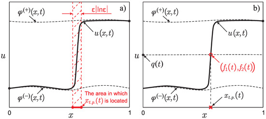 Under certain conditions (see [58]), the problem (1) can have a solution of a moving-front-type (see Figure 1). A solution of this type is a function that has a narrow inner transition layer in a small (of the order of ) neighborhood of some point moving according to the law . We call the point the “transition point” (“t.p”). Outside this neighborhood, the solution is close to one of two functions, or (see Figure 1a).