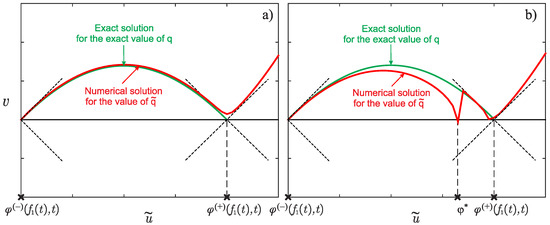 Typical form of a solution of a moving-front-type in Problem (1) at a fixed time t. (a) The physical meaning of the value ; (b) the formal definition of the value of when applying the methods of asymptotic analysis (see Section 2.2) or the gradient method for minimizing the target functional (see Section 3.1).