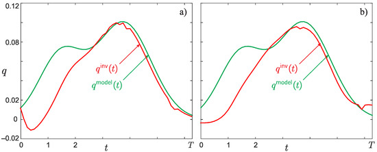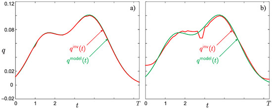Exact model solution (function ) and the result of its reconstruction (function ) from the input data of the inverse problem defined by function simulated for a set of model parameters (10) and with error (a) (matches ) and (b) (matches ).