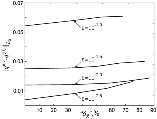 - Let us introduce noise into the simulated input data of the inverse problem as follows:where —a random number uniformly distributed on the segment and —the upper estimate of the experimental error in percent. Then, redefine .