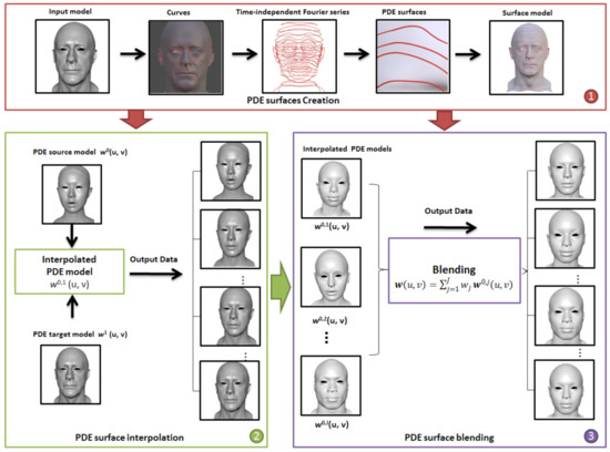 As shown in Table 1, interpolating the first (source) facial model and the second (target) facial model from the left in Figure 8 involves interpolating 31,331 vertices. In contrast, interpolating their corresponding PDE surfaces inly involves 6534 coefficients of Equation (25). It indicates that the total number of interpolation operations for polygon models are about five times of the total number of the interpolation operations for the corresponding PDE surfaces.