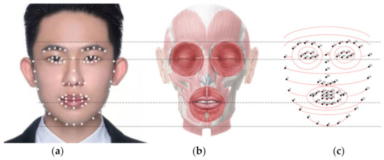 As shown in Figure 3, 68 facial landmark points shown in (a) and facial muscles shown in (b) are taken as references. According to the setting in Figure 3, we design a canonical 3D face curve template.