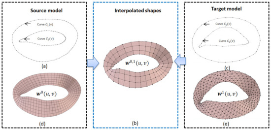 In the part of PDE surface interpolation to be examined in Section 5, one source model and one target model are interpolated to create intermediate shapes. We first use and to indicate the source model and the target model, respectively. Then, a linear interpolation is used to interpolate and , where and are given in Equations (20) and (21), respectively. The interpolation operation generates a new mathematical function of the interpolated PDE surface patches, which is given in Equation (25). The new mathematical function is used to create many intermediate shapes between the source facial model and the target facial model. Each of the created intermediate shapes is called an interpolated PDE model.
