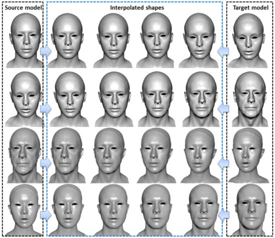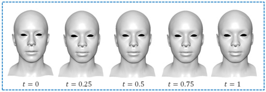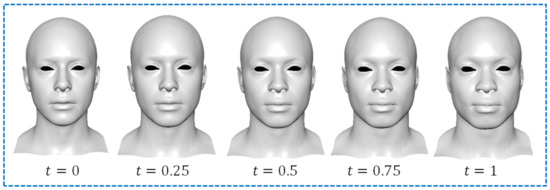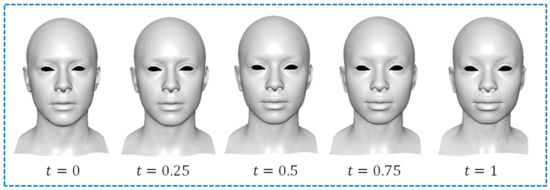 From Figure 7, we can see that as increases from to , the source facial models shown in the left column gradually change their shapes and finally become the target facial models shown in the right column. It demonstrates the correctness of Equation (25).