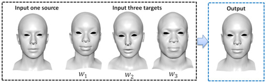 For the polygon representation of facial models, the existing method of facial blendshapes directly blends the vertices of these models together. If one of the source facial models and the target facial models have vertices and each vertex has three components , , and , we put the components , , and for all vertices into a column vector . The blend shape is expressed as [1]