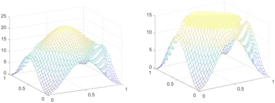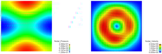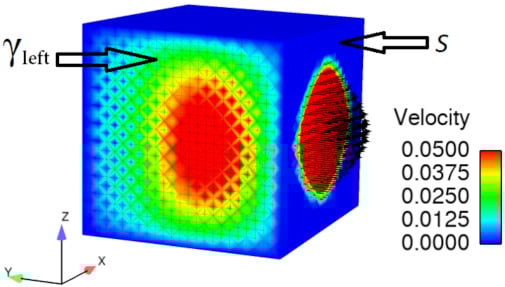 Until now, the velocity vector incorporates bubble components. These components are usually eliminated before the computational process []. In our case, we perform this elimination in a saddle-point formulation for , which leads to the reduced Lagrangian defined by: