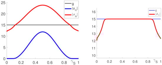 The aim of this section is to present main ideas of the path-following and the semismooth Newton methods that turned out to be highly efficient for solving frictional contact problems of solid mechanics [,,]. These algorithms have been adapted for the Stokes system with the threshold slip boundary conditions in 2D [,] and 3D []. The situation with the threshold leak conditions is different since only box constraints are imposed on the individual components of in 2D, as well as in 3D problems. In view of this fact the same implementation of the path-following method can be used in both cases. Also the semismooth Newton method works only with projections on compact intervals unlike the threshold slip boundary conditions in 3D in which case the components of are pairwise subject to spherical constraints and projections on circles are needed. Consequently, the finite termination property for the semismooth Newton method can be expected also for 3D problems.