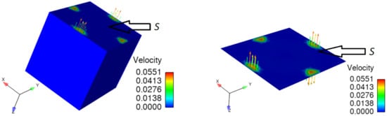 (Cube in 3D, non-unique solution). We change the partition of from Example 2 as follows: , , and . Let us remind that, if , the pressure might be non-unique depending on the choice of g. Next we suppose that g is constant and on S. To establish the critical value of g we use the Stokes system with the homogeneous Dirichlet data prescribed on the whole boundary . Assuming that its solution is smooth enough, , where is the corresponding normal stress. However since the whole procedure is applied to the finite element discretization, the regularity assumption is superfluous. For given physical data and the partition characterized by the parameters the value . It is easy to show that if , the problem has a unique solution with both, leak and no-leak zones on S. If , the solution is not unique and only no-leak zone appears on S. The behavior of the algorithms for different g is summarized in Table 9. One can see that both algorithms are stable in all cases. The table presents also the values and computed for the respective g. One can easily check that for , while if . The distribution of the velocity field on S for is seen from Figure 7. Note that the matrix used in (25), especially its part , has not the full row-rank due to . Consequently, and for are singular with the defect one and the eigenvector whose all components are equal to 1 corresponds to the zero eigenvalue. The matrix of the inner linear systems in Algorithm PF is regularized by adding the diagonal matrix to as seen from (31) (there are non-zero diagonal entries on the level of ). Analogously, the matrix in Algorithm SSN is regularized by adding to (see (41)) and by the choice of the active set . These heuristic arguments show that the matrices of the solved linear systems can be regularized by the construction of the algorithms. Finally note that the condition number bounds of the preconditioned Schur complements (32) and (42) are no longer valid. Nevertheless, the preconditioners can still be used and play the same important role as in the previous examples.