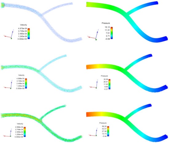 (3D branched tube). Let be the branched tube as in Figure 8, where the partition and the partition of the boundary is also depicted. This tube may represent a final part of the capillary in the human body. On we prescribe the input velocity , with , while consists of two outputs of the tube with the natural outflow condition . The leak condition is prescribed on . Further in , , and . The partition is characterized by the following values of the parameters: , , and . The behavior of Algorithm PF and Algorithm SSN for different g is reported in Table 10. The distribution of the velocity and the pressure for three selected g is depicted in Figure 9. Almost all liquid leak through the wall at the vicinity of for the smallest value can be observed, see Figure 9 (top). The leak through the wall is minimal for , see Figure 9 (bottom). The pressure is also growing for higher values of g. The zoomed parts of the velocity fields near and are depicted in Figure 10 (the velocity distribution inside the tube looks like the Poiseuille distribution). We used the reorthogonalization technique of the descent vectors inside the CGM solver [] that increases considerably efficiency of computations; compare Table 10 with Table 11.