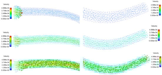 Distribution of the velocity field on S for , , and ; the whole cube (left) and S (right).