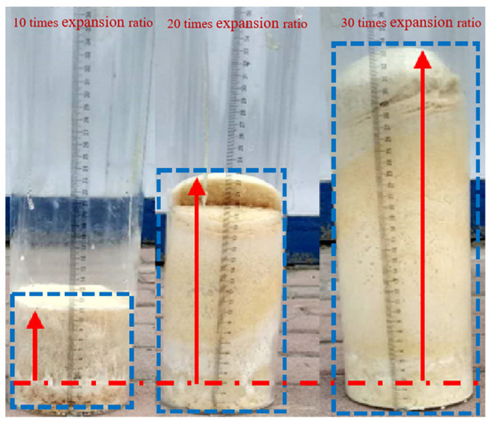 Figure 1 and Figure 2, respectively, show the morphology photos of the consolidated body of three polymers in the reaction cylinder and the comparison diagram of slurry height before and after the reaction. It can be seen from the figure that the three polymer grouting materials have expanded to a certain extent after reaction. In particular, it can be clearly seen from Figure 2 that the three polymers have expanded from the original height of 2.5 cm to 11.5 cm, 21 cm and 31.5 cm, respectively. In addition, the heights of consolidated polymers with 20 and 30 times the expansion ratio are 1.83 and 2.74 times, respectively. It can be proved that the ex-factory expansion ratio of the three polymers is reliable within the allowable range of test error.