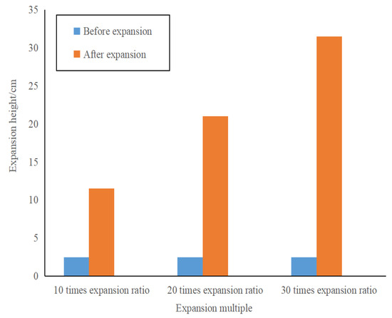 Here, three kinds of polymer grouting materials (10 times expansion rate, 20 times expansion rate and 30 times expansion rate) are taken as the research object. First, the ex-factory expansion rate of the polymer is calibrated and verified. A self-made reaction vessel for measuring the expansion rate of polymers was made according to the requirement of the test (Figure 1), which is mainly composed of a plexiglass cylinder with a bottom. Meanwhile, in order to observe the change of expansion volume, a scale is pasted on the reaction cylinder, and a high-definition camera(HD) is used to capture the expansion rise height of the polymer at different times. The two-component polymer grouting materials are mixed according to the requirements of the same quality and poured into the reaction vessel for reaction expansion at room temperature.