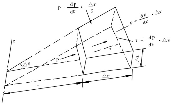 Taking any fluid unit from the basin (see Figure 4), the external force on the fluid element are a normal stress p and the shear stressτ, and there is no shear resistance between the radial planes perpendicular to the crack plane. If the influence of velocity change is not considered, the sum of the respective force along the direction of the center radial axial axis of the single element should be equal to zero [26].