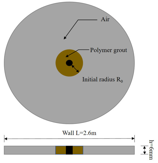 The schematic diagram of single crack grouting [14] is shown in Figure 3, and its opening of crack is h, and the radius of grouting hole is R0. It is assumed that the polymer slurry will flow radially around the grouting hole between the upper and lower crack surfaces; and ignoring the grouting pressure in the grouting hole, the slurry will flow in the crack completely by virtue of the volume expansion mechanism.