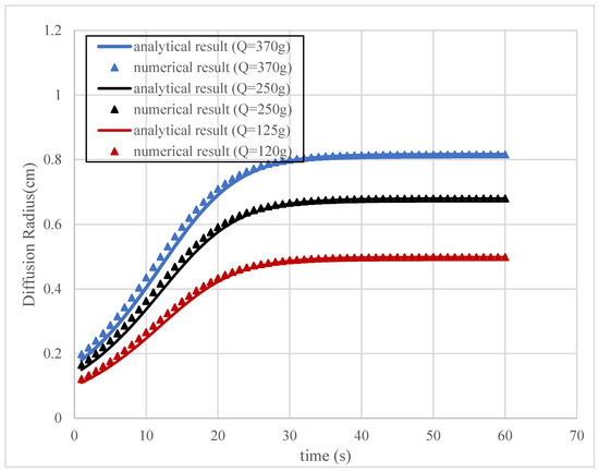 The reliability of the grouting model is verified by comparing the numerical solution with the analytical solution. Figure 6 shows the theoretical curve and simulation curve of diffusion radius with time under different grouting quantities. It can be seen from the figure that the curve obtained by the present model is consistent with that obtained by numerical simulation., and the diffusion range of slurry gradually increases with time and tends to be stable at 30 s. In addition, it is observed that the time-consuming of slurry expansion and the diffusion stage is not related to the grouting quantity. When the grouting quantity is 125 g, 250 g and 170 g, the slurry stops diffusion at about 30 s. At this time, the slurry stops expanding and reaches the maximum diffusion range, which is the effective diffusion area of the slurry. It can also be seen from the figure that the effective diffusion area of the slurry is directly proportional to the grouting volume.