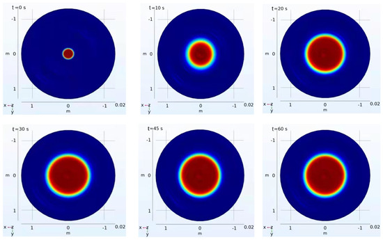 Figure 7 shows the simulation results of the change of slurry volume fraction with time. It can be seen from the figure that the slurry diffusion form of single crack grouting is circular, and gradually diffuses outward in concentric circular form with time, finally reaching the effective diffusion area of slurry, which is consistent with the diffusion form assumed by the present theoretical model.