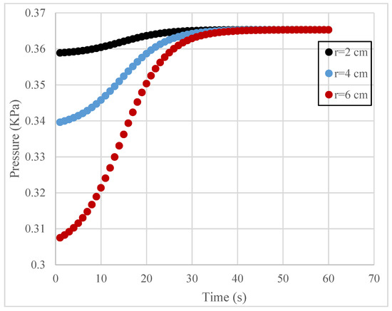 Table 1 shows the simulation results and analytical results of the pressure distribution with time at 2 cm away from the grouting hole when the grouting amount is 250 g. It can be seen from the Table 1 that the diffusion pressure gradually increases with time and finally tends to be stable. The maximum relative error between the numerical solution and the analytical solution is 0.9%, and the average relative error is 0.28%.