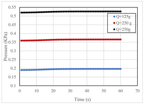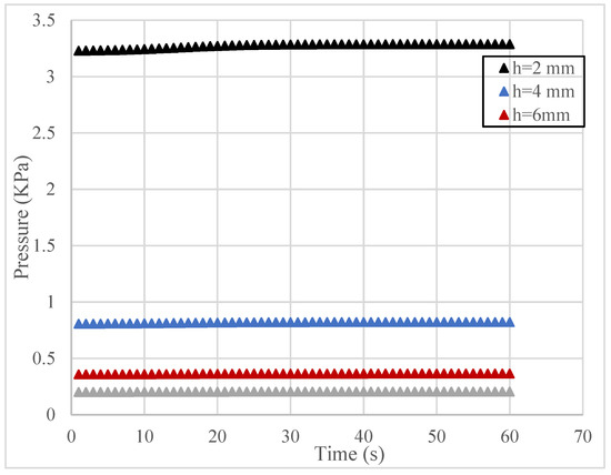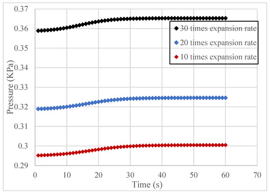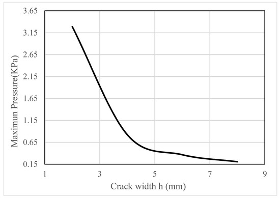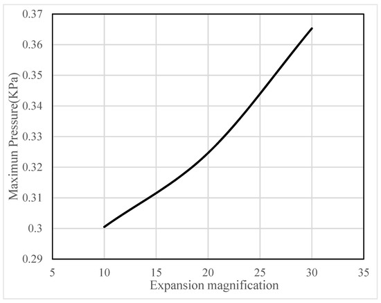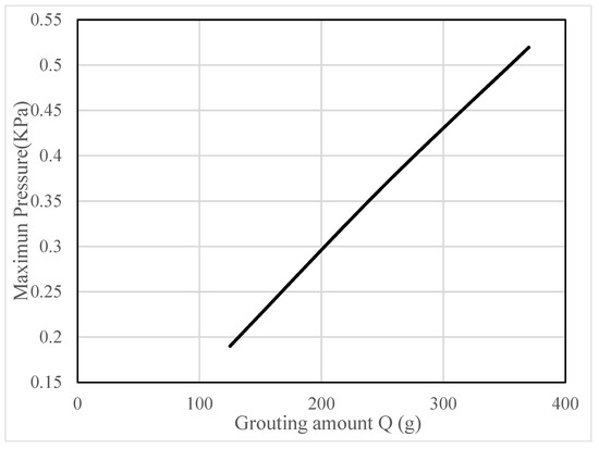 Figure 10 shows the variation curve of pressure with time under different grouting quantities at the radius r = 2 cm. It can be seen from the figure that the pressure increases slowly with time, and finally the pressure tends to be stable. Figure 11 shows the relationship curve between the maximum pressure and the grouting amount. It can be seen from Figure 10 and Figure 11 that the diffusion pressure is directly proportional to the grouting amount. Figure 12 shows the change of pressure with time under different crack opening, and Figure 13 shows the relationship curve between the maximum pressure and crack opening. It can be seen from Figure 12 and Figure 13 that the diffusion pressure is inversely proportional to the grouting volume, and the diffusion pressure is very sensitive to the change in the crack opening. When the crack decreases from 4 mm to 2 mm, the pressure increases rapidly, the crack opening decreases from 8 mm to 2 mm, and the maximum pressure value increases by a factor of 20. Figure 14 shows the change curve of pressure with time under different expansion ratios, and Figure 15 shows the relationship curve between the maximum pressure and expansion ratio. It can be seen from Figure 14 and Figure 15 that the diffusion pressure is directly proportional to the grouting amount. In general, the grouting volume, the crack opening and the expansion ratio are three key factors affecting the slurry pressure field.
