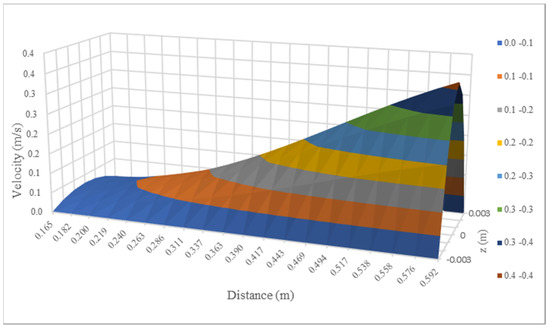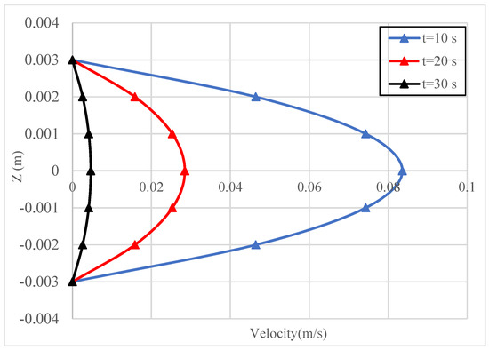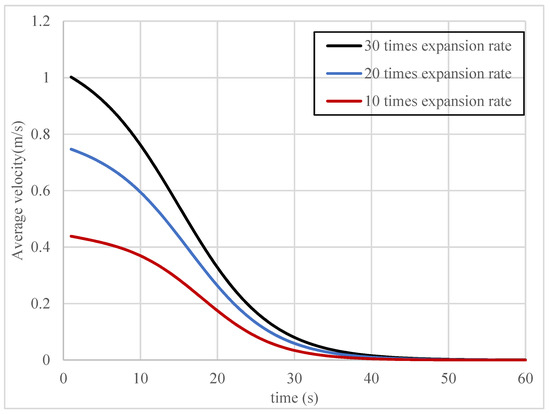 Table 3 shows the flow velocity values at different positions on the fracture section when t = 20 s, which can be described as an intuitive three-dimensional distribution of flow velocity, as shown in Figure 16. It can be seen from Table 3 and Figure 16 that the farther the fracture section is from the grouting hole and the fracture wall, the greater the diffusion pressure is. Figure 17 and Figure 18 show the velocity on temporal and spatial distribution characteristics of slurry. Figure 17 shows the velocity variation of slurry with radial distance at different times. It can be seen from the Figure 17 that the slurry velocity increases along the radial direction, and the velocity reaches the maximum at the interface between slurry and air. Figure 18 shows the velocity variation curve of slurry along the z-axis direction at different times. It can be seen from Figure 18 that the slurry velocity presents a parabolic distribution in the z-axis direction, and the velocity reaches the maximum at the midpoint of the fracture (z = 0) and reaches the minimum at the fracture wall, and the velocity is zero. It can also be seen from Figure 17 and Figure 18 that the slurry flow rate gradually decreases with time and finally becomes zero. Figure 19 and Figure 20 are the time-varying curves of flow velocity at the interface between slurry and air under different grouting amounts and expansion ratios. It can be seen from Figure 19 and Figure 20 that the greater the grouting amount and expansion ratio, the greater the interface flow velocity; the grouting amount and expansion ratio are the key factors affecting the flow velocity.