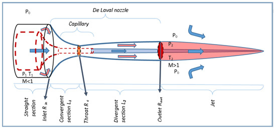 De Laval nozzles consist of four parts, namely the straight part, the convergent part, the throat, and the spread part (Figure 1). The flow of compressed gas (Table 1) has a high degree of turbulence, which is not conducive to gas shrinkage in the convergent section of the nozzle. Therefore, a straight section is established in front of the convergent part of the nozzle to ensure an even distribution of the flow inlet velocity.