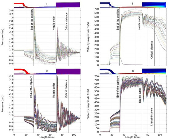 Comparing the gas flow pressure shift of Witoszynski (Figure 2A) and Bicubic (Figure 2C) curve nozzle geometry, we see that the Witoszynski geometry responds to changes in parameters more than Bicubic. The Bicubic curve geometry proves to be very sensitive to the radius of the nozzle throat parameter, while the Witoszynski curve geometry shows a larger gas flow pressure drop in the capillary tube, a smoother transition between parameters, and lower fluctuations in the nozzle outlet. By comparing the velocity parameter shift of Witoszynski (Figure 2B) and Bicubic (Figure 2D) curve nozzle geometry, we see that Witoszynski geometry shows higher velocities in the capillary tube, but lower velocities in the divergent section and a sharper decay than the Bicubic curve geometry.