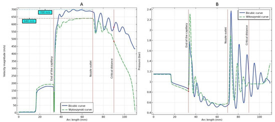Comparison of the velocity (A) and pressure (B) of Bicubic and Witoszynski curve nozzles.