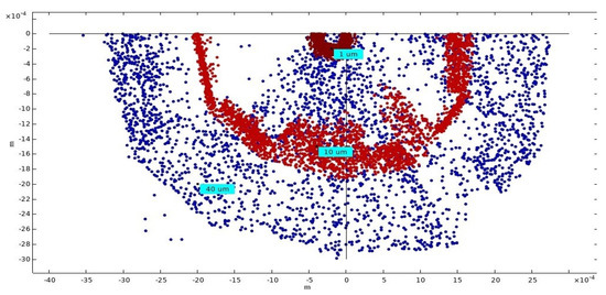 Particle tracing for fluid flow interface is used to simulate the motion of particles in a background fluid. We are specifying the particle density and diameter in our numerical calculation. It is known that the velocity decreases with the increase of particle size. Three different sizes of copper particles are used in our simulation: 1 μm, 10 μm, and 40 μm (Figure 4). The 1 μm particle was chosen as a particle with maximum velocity, 10 μm with half velocity, and 40 μm with low velocity. Particles larger than 40 μm have similar low velocity as well; therefore, 40 μm was chosen as the maximum particle size.