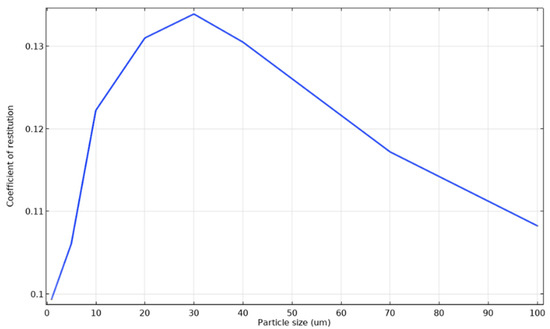 The main results of numerical simulations are characterized by the coefficient of restitution (COR) and substrate indentation. The COR is defined as a ratio between the rebound and impact velocities (here, the average velocity of particle mass after rebound obtained by CFD simulation is considered as the rebound velocity). The energetic interpretation of COR is used to define the loss of energy during the impact. The experimental results presented in [34] show that the decreasing of COR below 0.1 leads to the particle sticking to the substrate. Our obtained variation of COR of different diameter particles is shown in Figure 6. COR has the highest value for the particle diameter of 30 μm. Smaller particles have a higher velocity, which reduces COR due to the increase in kinetic energy of the impact. Particles larger than 30 μm reduce COR due to their increased mass.