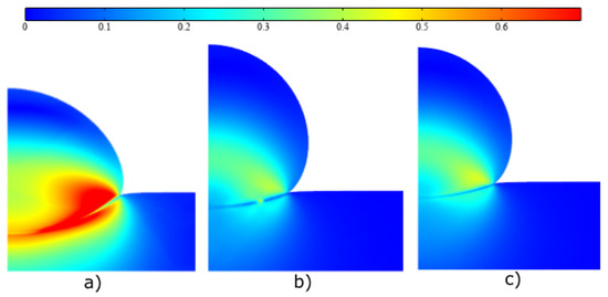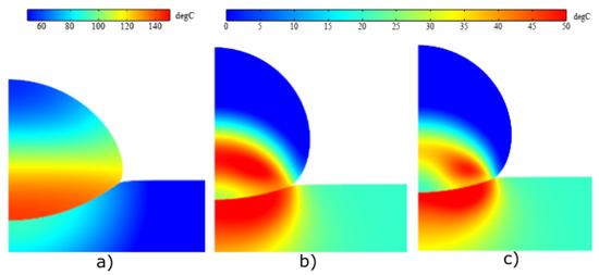 The color plot of the induced plastic strain is shown in Figure 8, whereas the resulting temperatures are presented in Figure 9. For the first region, with an increase of particle diameter, a considerable reduction of strain is observed (Figure 8a), whereas the variation of plastic strain in the second region is indistinguishable (Figure 8b,c).