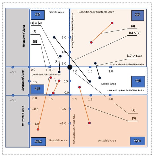 For practical purposes, the subsequent goal was formulated in the form of a stability diagram. Therefore, a stability diagram is created in order to process control and for use in the visual assessment of the consistency between causality and contingency (see Figure 1). The stability diagram is divided into four real quadrants (Q1, Q2, Q3, and Q4), supplemented by two complex quadrants (Q3c and Q4c) and three forbidden areas (i.e., more precisely than the quadrates; the areas should be called ninths of the graph). Here, the Cartesian system is shifted to point [,]. This shift is because real–theoretical likelihood ratios are applied in the system, where the horizontal axis is determined for real likelihood ratios, and the vertical axis is determined for theoretical probability ratios. A ratio value equal to one indicates the identity of the marginal frequencies for the data subsets for real ratios. A value different from one then tends to dominate in a given classification of one set.