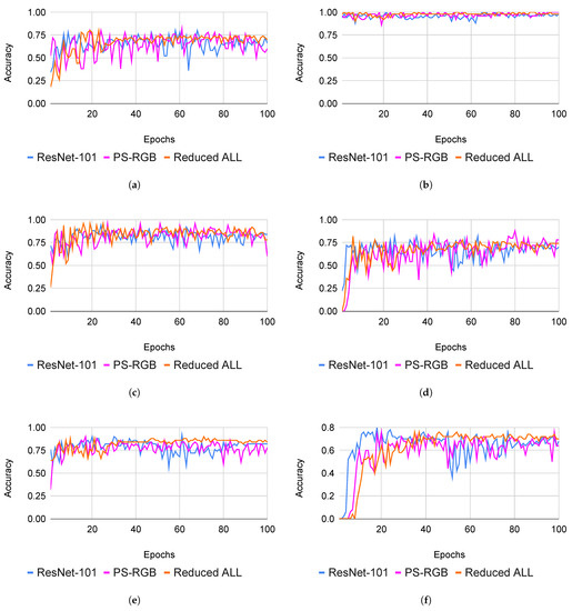 The accuracy curves of ResNet-101, PS-RGB, and Reduced ALL plotted versus training epoch on each of the 7 classes in the testing set. (a) Class 1 (melanoma, MEL). (b) Class 2 (melanocytic nevus, NV). (c) Class 3 (basal cell carcinoma, BCC). (d) Class 4 (actinic keratosis, AKIEC). (e) Class 5 (benign keratosis, BKL). (f) Class 6 (dermatofibroma, DF). (g) Class 7 (vascular lesion, VASC).