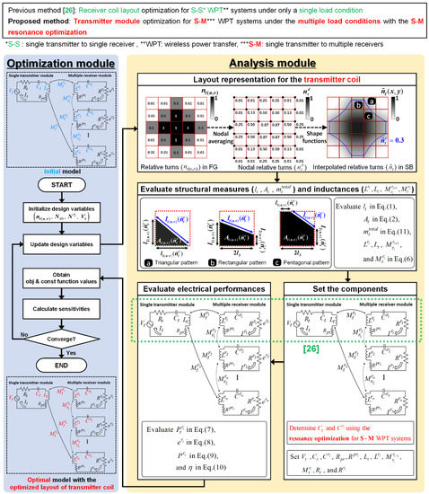 - In the optimization module, the objective function (e.g., total power transfer efficiency in this paper), constraint functions (e.g., the load voltage of each receiver module and coil mass), and sensitivities are evaluated from the performances calculated in the analysis module. Then, if the convergence criteria are satisfied, the values of the design variables at the last iteration are determined as the optimal value of the design variables for the S-M WPT systems. If not, this process is continuous by using the design variables updated based on the sensitivities until the convergence criteria are satisfied.