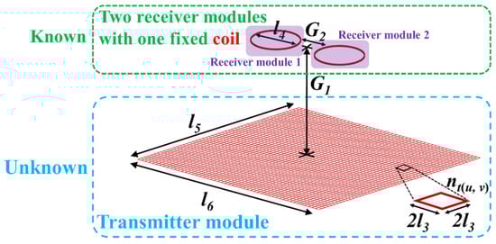 Assuming that a current flows along the fixed coil of each receiver module () of the S-M WPT system, the magnetic field intensity () at a certain field point P (x, y, z) in the design space of the transmitter coil induced by the coil in ith receiver module can be derived according to Biot_Savart’s law when the receiver coil is represented to interpolate the smooth boundary coil by applying the previous concepts (see Section II.A of our previous paper [24] and Section II.B of our previous paper [25]). Using the sum of the magnetic field intensity at the point P provided by the jth finite coil segment (including the information of the starting point () and the ending point ()) virtually represented for the practical receiver coil to calculate the magnetic field intensity between the receiver coils and transmitter coil, the total magnetic field intensity at the point in the transmitter module can be derived as: