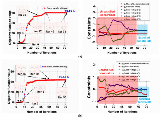 In the second case, the proposed method tried to improve the power transfer efficiency from the iteration of 75 in the feasible design area that satisfied all constraints. However, it was difficult to increase the efficiency because the load voltage of the receiver module was not satisfied at the iterations of 80, 81, 83, 85, etc. The main reason why the efficiency was not improved more can be that the physical strength of the magnetic flux according to the distance between the transmission coil and receiver coil cannot increase the efficiency while maintaining the required rated powers, although the change of the transmitter module was tried.