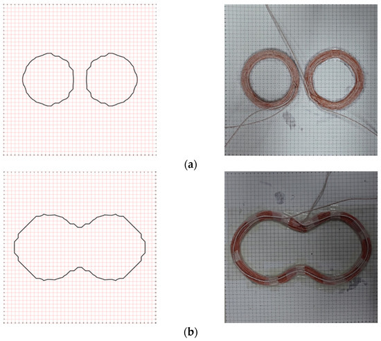 Optimized transmitter coil according to the air gap of 10 mm and 30 mm (the left and right columns show the transmitter coil optimized by the proposed method and transmitter coils fabricated for experiments, respectively). In the case of the 10 mm air gap, the optimized transmitter coil is a single transmitter coil connected in series, although the number of the topology for the transmitter coil made by the proposed method is two. (a) Air gap of 10 mm; (b) Air gap of 30 mm.