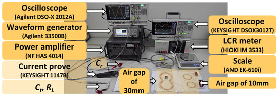 As indicated in Figure 4, the determined optimal transmitter coils were transformed to the experimental coil for experimental validation. Figure 5 shows the experimental setting for the experimental validation. A low-power AC signal with 100 kHz was produced by a waveform generator (Agilent 33500B). Then, the low-power signal was changed to a high-power AC current by the power amplifier (NF HAS 4014). The AC current operates the S-M WPT systems.