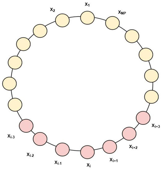 The key concept is to update the old solution to the new one in a small neighborhood using the best solution. The initial population is a vector (D-dimensional). The neighborhood radius r (where 2r + 1 <) is defined for each vector ; that is, neighborhood comprises of . The vectors here are structured according to their indices into a ring topology [35]. Figure 1 represents the notion of the LNS model, which is defined as: