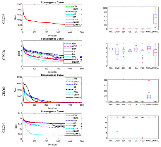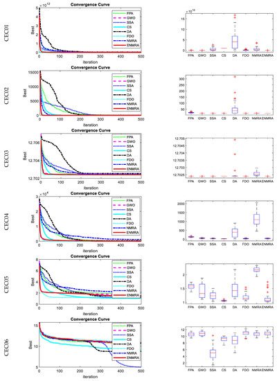 When compared to competitive algorithms, ENMRA’s results for CEC06 and CEC07 functions were the worst. In terms of the best-acquired fitness performance, ENMRA’s results for function CEC08 were better. For CEC09 and CEC10 functions, ENMRA’s findings were comparable to those of other methods.