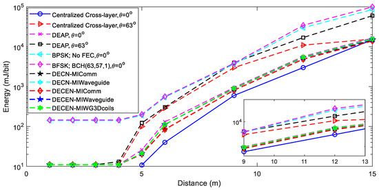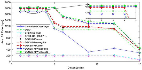 Figure 8 depicts the average bit rates of layered and cross-layered systems (i.e., DECEN, DECN, DEAP, and centralized). Cross-layer design is preferable over layered design because of its higher bit rate. On the other hand, the proposed DECEN outperformed the centralized system for almost all transmission lengths and allowed for a much greater bit rate, especially over medium communication ranges. This was because our distributed method was not constrained by the severe power limits of two-hop neighbors, like a centralized system, which is always the worst-case situation. Instead, DECEN employed the ENMRA optimization algorithm to manage each sensor’s transmission power distribution better and increase its performance.