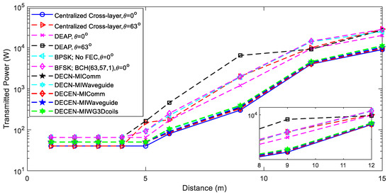Figure 6 and Figure 7 illustrate the results for a successfully decoded payload bit on the receiver. Because centrally regulated power gives more network information, it uses less energy and power than the proposed distributed method. Such assumptions can only be reached theoretically with a massive interchange of control signals, untenable in real-world settings, such as WUSNs. DECEN enabled the MAI power level, and the received noise at the receivers became the transmitter’s only required information. It allowed for practically centralized energy usage and even achieved efficiency over extended transmission distances. The effect of the coil angle inaccuracy on the DECEN was not considered, and actual applications did not permit the use of multilayer arrangements. In this setting, DECEN and the central design required about the same amount of energy even over small transmission distances. Huge antenna size, dynamic channel conditions, and small communication range were addressed by MI-based WUSNs using MI waveguide and 3D MI coils, making them better for underground communication. Cross-layered architecture proved superior to traditional layered protocol architecture in terms of energy savings and link reliability.
