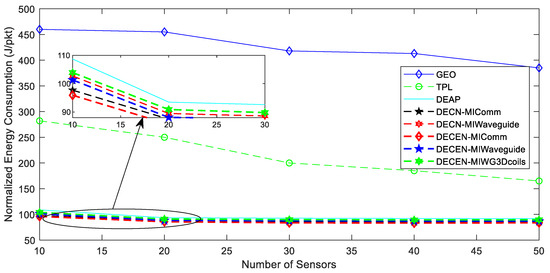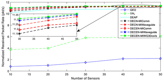 Figure 9 and Figure 10 depict the normalized energy usage and packet rate for the successfully received end-to-end data flow, respectively. As the number of sensor nodes grew, better routes became available, and a wider variety of cooperatives emerged. In all of the simulated procedures, these benefits were demonstrated by lower energy usage and higher throughput. Without interchanging data between the multiple layer functionalities and employing a layered strategy, GEO precisely picked the set of nodes that advance successively closest to their target, principally in terms of geographical progress and the poorest performance. TPL reduced the amount of transmitted power required in multihop scenarios, resulting in improved energy savings, more connections, and longer routes. Our solutions delivered the best energy and performance by overcoming GEO, TPL, DEAP, and DECN solutions with higher throughput gain and more energy savings. It is because combining the optimization of several layers’ communication features yielded significant synergy in terms of boosting system performance from one end to the other. The suggested DECEN’s appropriateness for underground conditions was confirmed by its outstanding spectral and energy efficiency, as well as its lower computational complexity. As a result, we propose a novel protocol for efficient and dependable MI communication, as well as a new cross-layer approach in WUSNs.