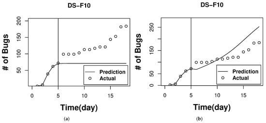 Similar to previous studies [,], we focused on the Logistic model, which is the most suitable concerning fitness for the collected experimental datasets. We employed the model using the number of detected bugs and detected time. The Logistic model can be expressed as