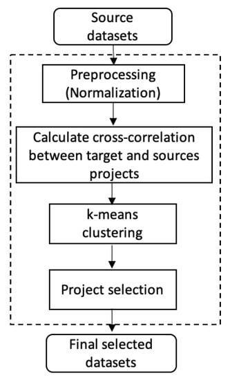 In earlier studies, cross-project predictions models have been utilized to resolve the requirement of huge historical data. However, one challenge in the cross-project prediction is that the distribution of the source and target project usually differ significantly [,]. If the training data contain all the source project data, a poor prediction quality can result. Ideally, one defect prediction model should work well for all projects that belong to a group [].
