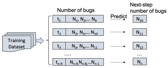 To employ the LSTM model, the input to the network at each time step is a vector of the number of bugs, and the single output is the number of bugs for the next step. Figure 4 shows the process of LSTM training at each time step. Because the ranges of the input values can vary, the values of bugs are scaled into the range of zero to one. By considering the prediction process as a time series, the input layer receives the values of the number of bugs for nine days, and the single output node produces the prediction for the next day. By shifting by one in each step, the model is trained to the maximum days of the training dataset. The model is trained with 300 epochs because the results are similar to those using 500 epochs. The stochastic gradient descent method is employed using the mean squared error loss function.