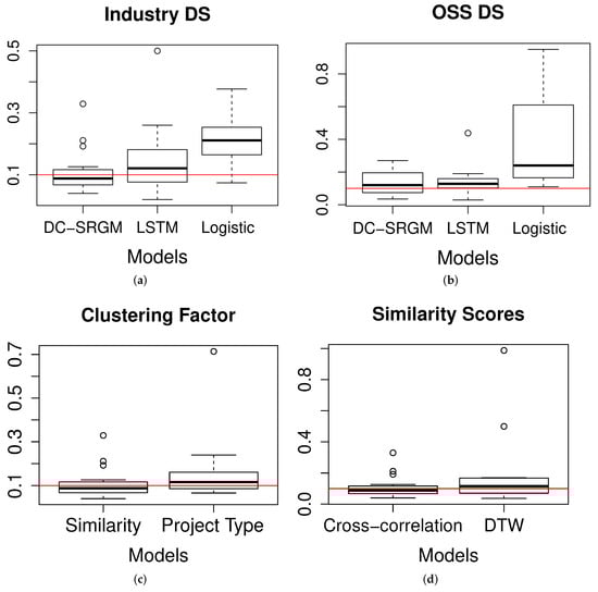 On the other hand, the project domain type-based model was close to the threshold. Hence, project clustering by similarity scores affected the model’s ability to obtain suitable project data to learn the number of bugs. Although the domain was the same, clustering by project domain type did not affect the model performance. There are irrelevant projects with very different growth patterns for bugs even though they are in the same domain. Therefore, DC-SRGM modeling should be performed using the project similarity scores as the priority rather than the project domain type.