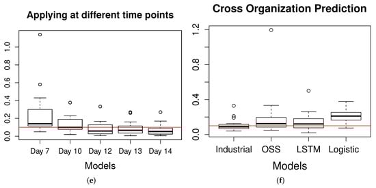 To determine the impact of the amount of data from an ongoing project applied in DC-SRGM modeling, the experiment was conducted using the target datasets from industrial data on days 7, 10, 12, 13, and 14. The model’s performances at different time points were compared to determine a suitable time frame to apply DC-SRGM in ongoing development stages. Table 11 shows the AE values of the models at each time point. Figure 6e compares the median of AE values at each prediction time point. Accurate results were not obtained when applying DC-SRGM on day 7 of ongoing projects, but a few projects had significant improvement upon using them on day 10. Applying the model on day 12 or later improved the AE values. Overall, the proposed method can identify the correct clusters and achieve stable results starting from day 12. Therefore, DC-SRGM can be applied to ongoing software development projects beginning on day 12.